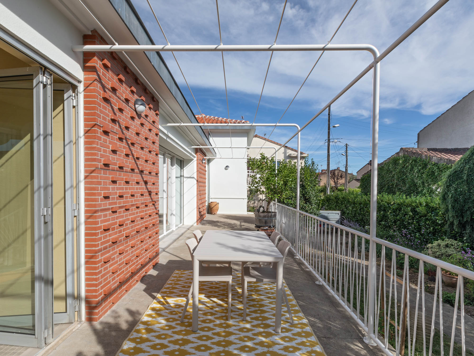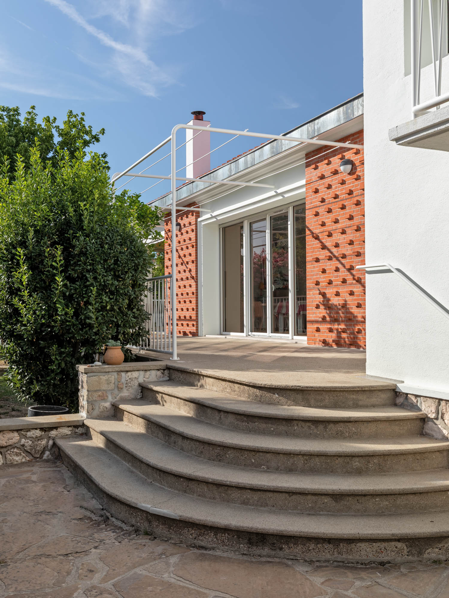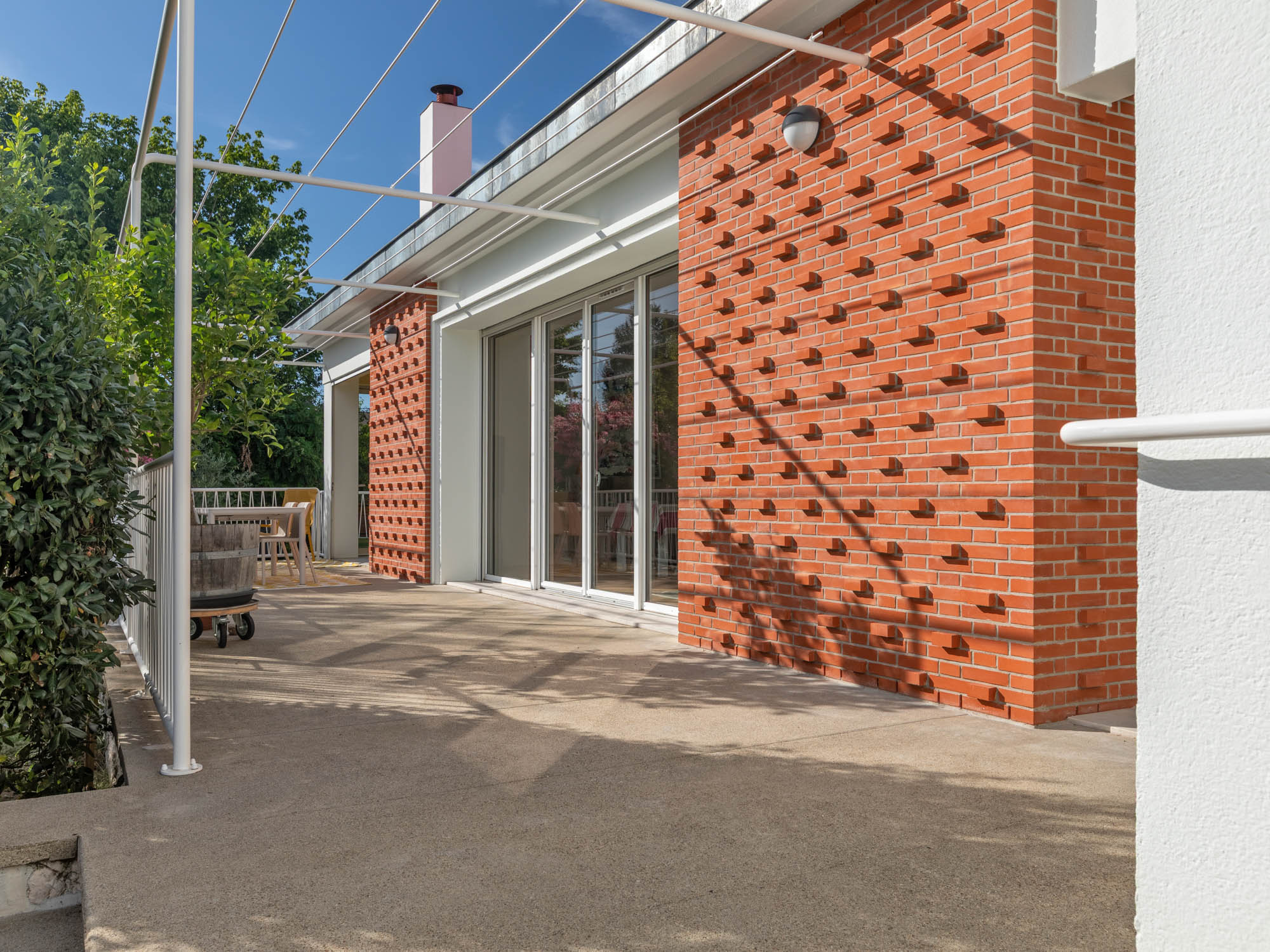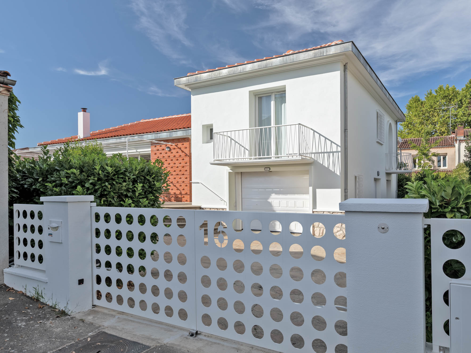 Dessinée par l’architecte Bernard Durand, célèbre pour ses villas de Hossegor, cette maison a été livrée à Albi en 1958. Conservée dans son stricte état d’origine, elle va connaitre une restauration totale de la toiture aux façades en passant bien entendu par une rénovation thermique qui permettra de passer de l’étiquette énergie G à A. A l’occasion des travaux les garde-corps sont redessinés, une pergola ajoutée et un doublage de briques vient animer la façade. Un soin particulier est accordé au porche d’entrée de cette maison rénovée dans le pur style années 50.
